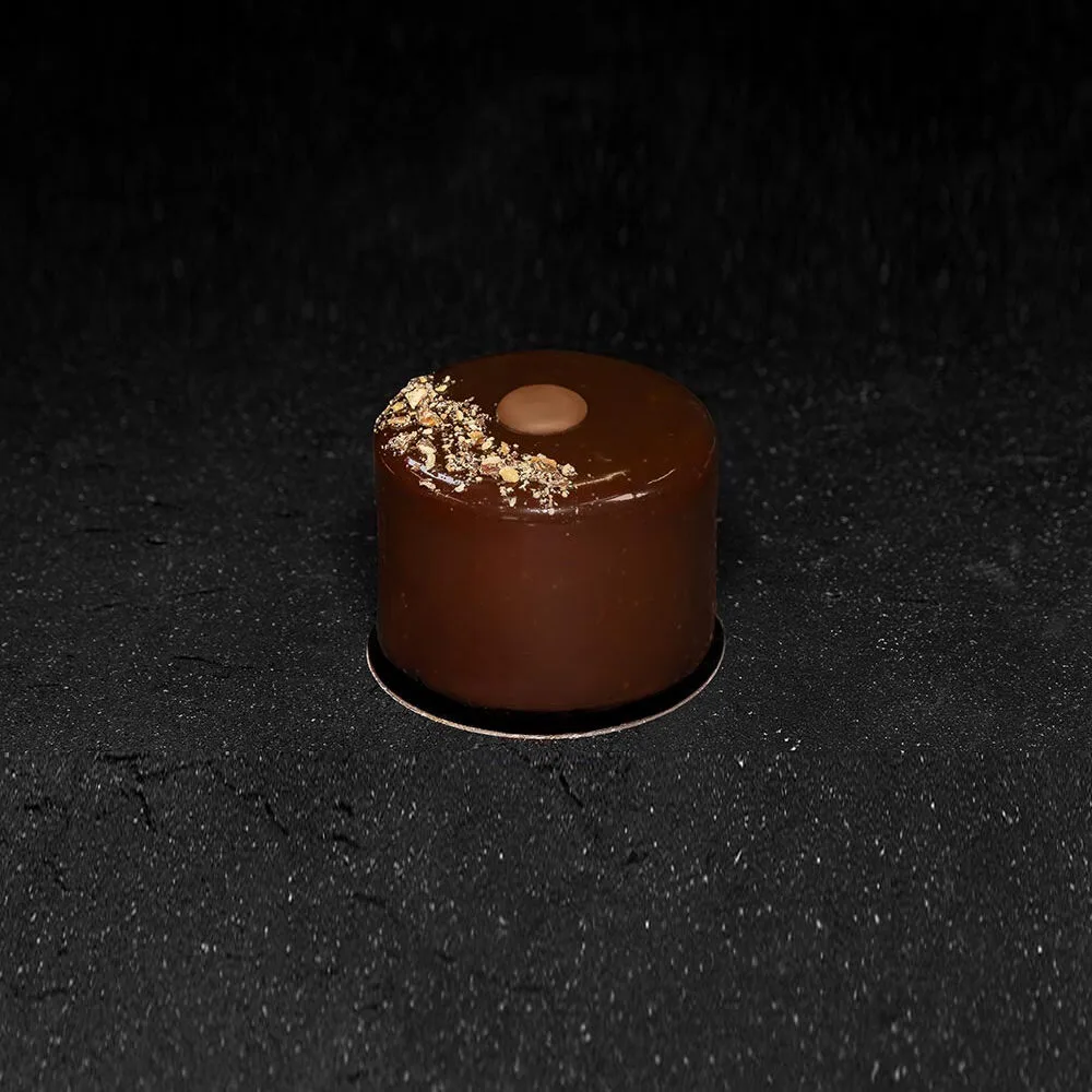 Fluffy chocolate sponge cake with chocolate filling and Ferrero glaze coating.