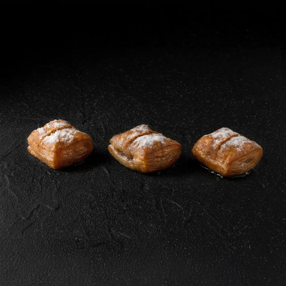 Fluffy puff pastry in light syrup with homemade apple filling and cinnamon notes.